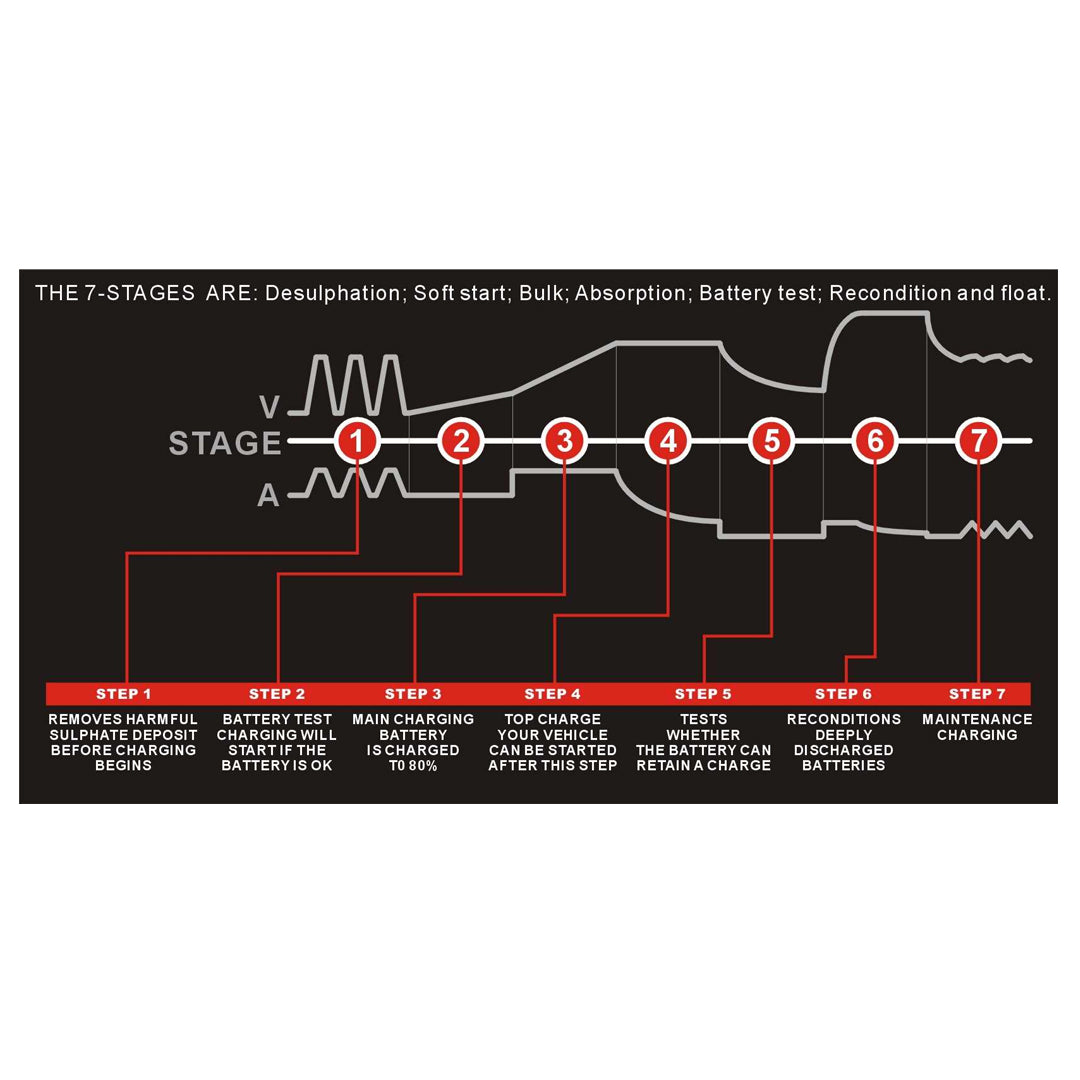- Erhaltungsladung: Die Erhaltungsladung hält die Batterie bei 100 % Ladung, ohne sie zu überladen oder zu beschädigen. Das bedeutet, dass das Ladegerät unbegrenzt an die Batterie angeschlossen bleiben kann.