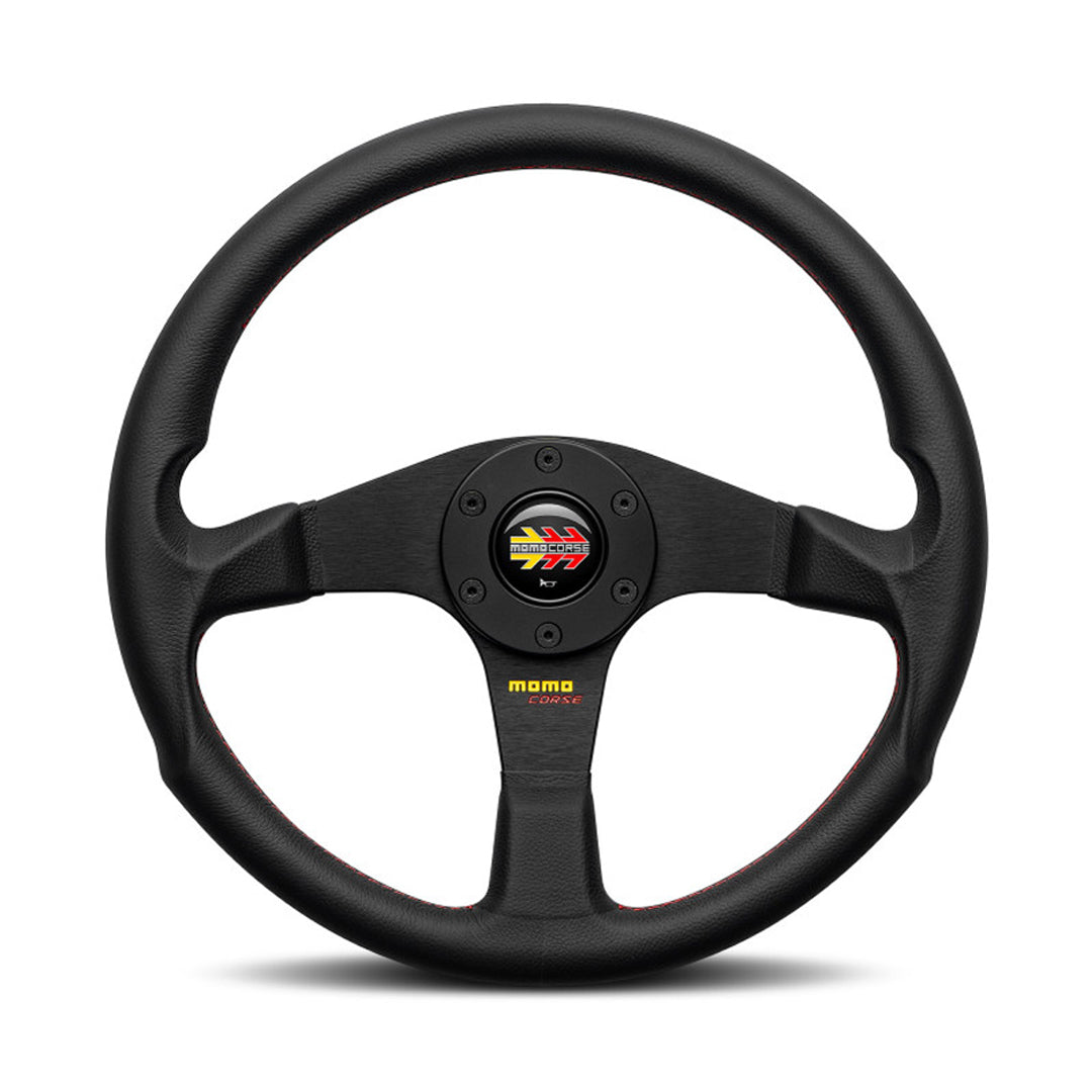 Designed to deliver the ultimate driving experience, the Corse 2.0 features a full premium leather rim with ergonomic rear grips and striking red parallel stitching. The black aluminium spokes are paired with a matching black centre ring, while the hand-enamelled red and yellow MOMO Corse logo adds a distinctive finishing touch. Completing the look is the world-famous MOMO Corse arrow emblem.